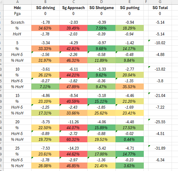 For the developers, even though comparing SG by handicap level could be an interesting feature later on, it would be better first to expand the depth of SG data within each game area (Driving, Approach, Short Game, Putting).