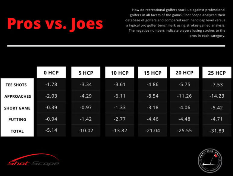 Note: as Mark Broadie explains in Every Shot Counts, SG values are averages and must be interpreted carefully. The key is to assess the balance between the different areas of your game: for instance, a 10-handicap player can have Tour-level putting but weaker approach shots.
