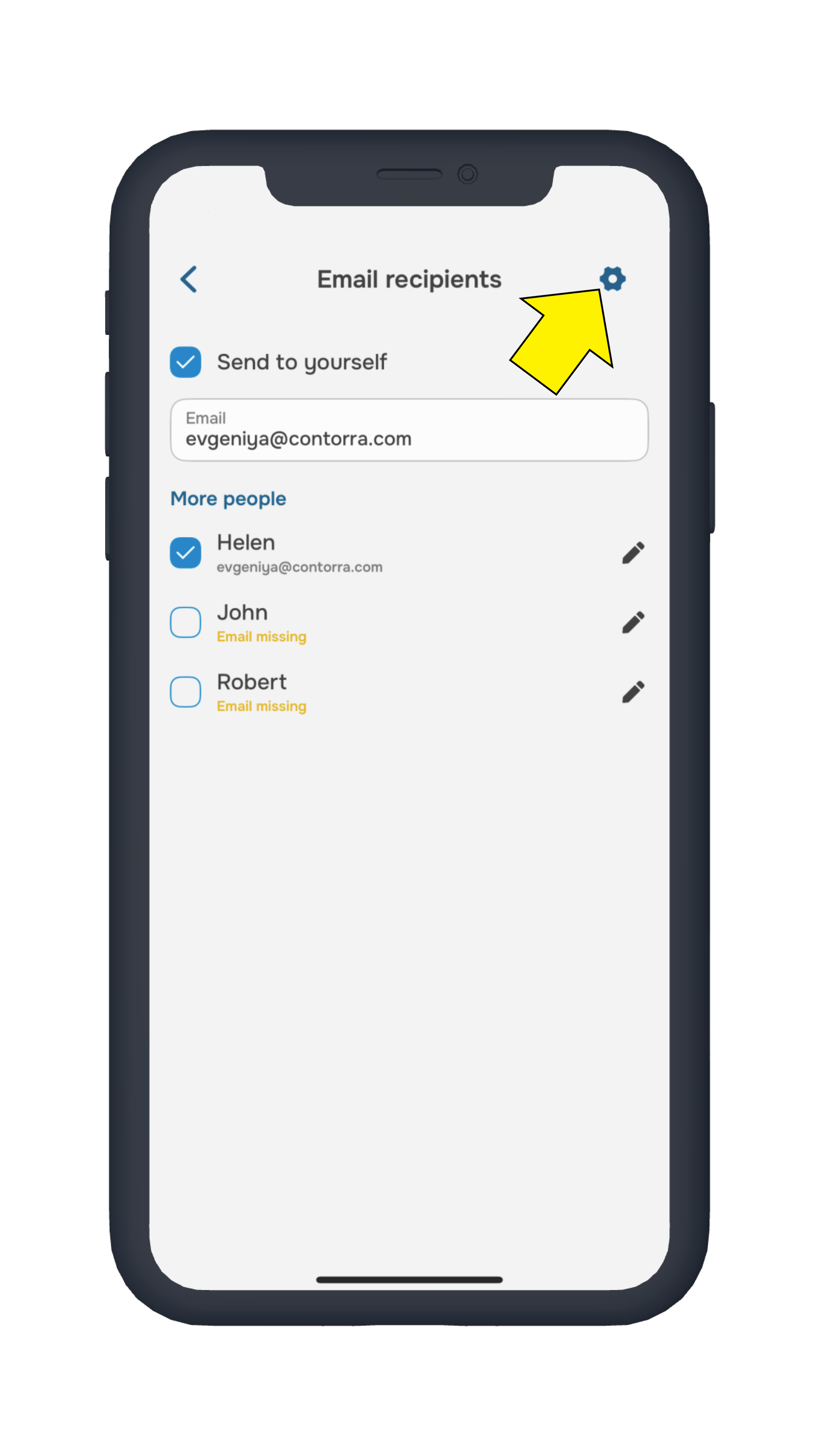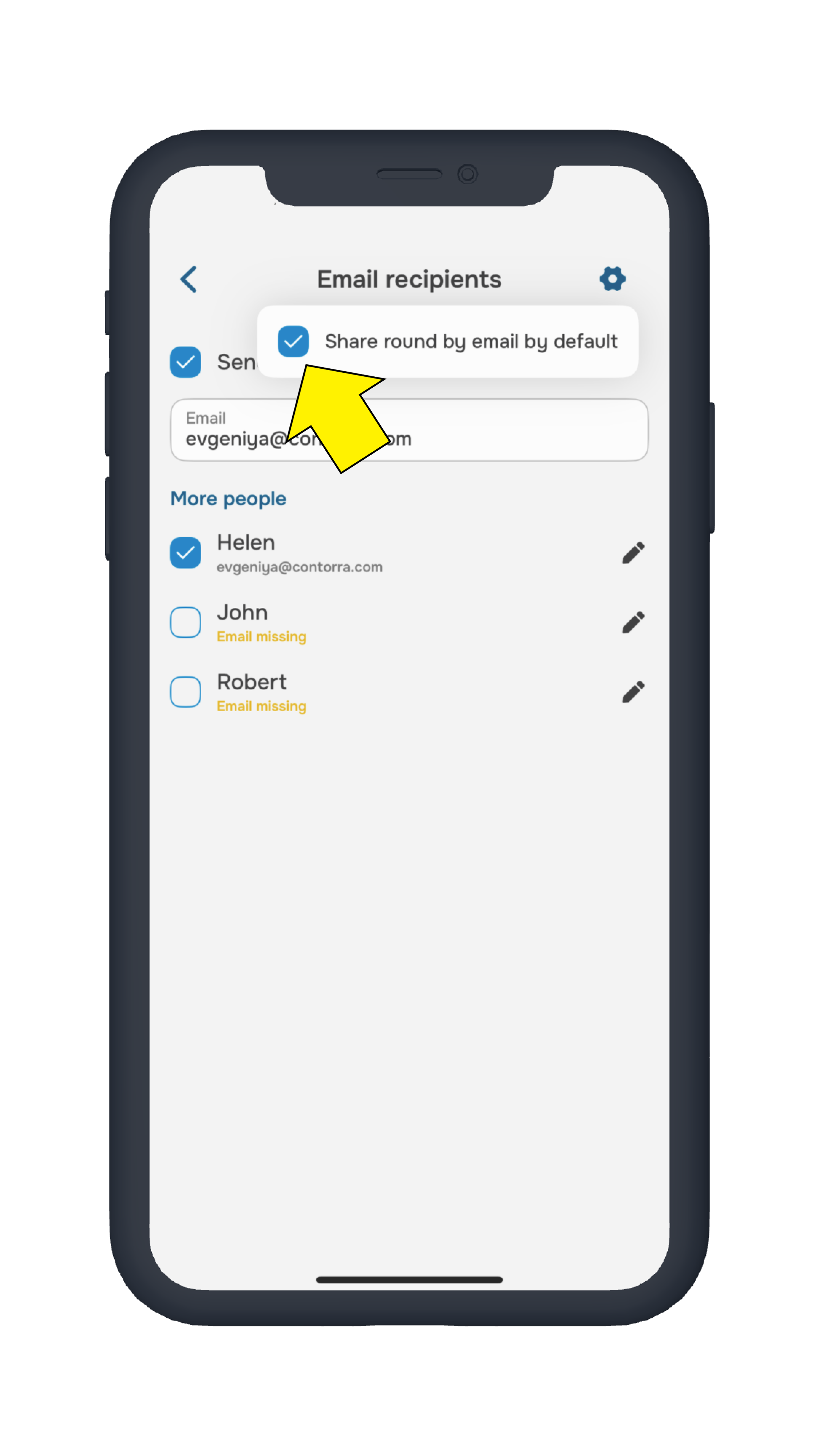 On iPhone, please tap the settings icon in the top right corner and check the box "Share round by email by default".