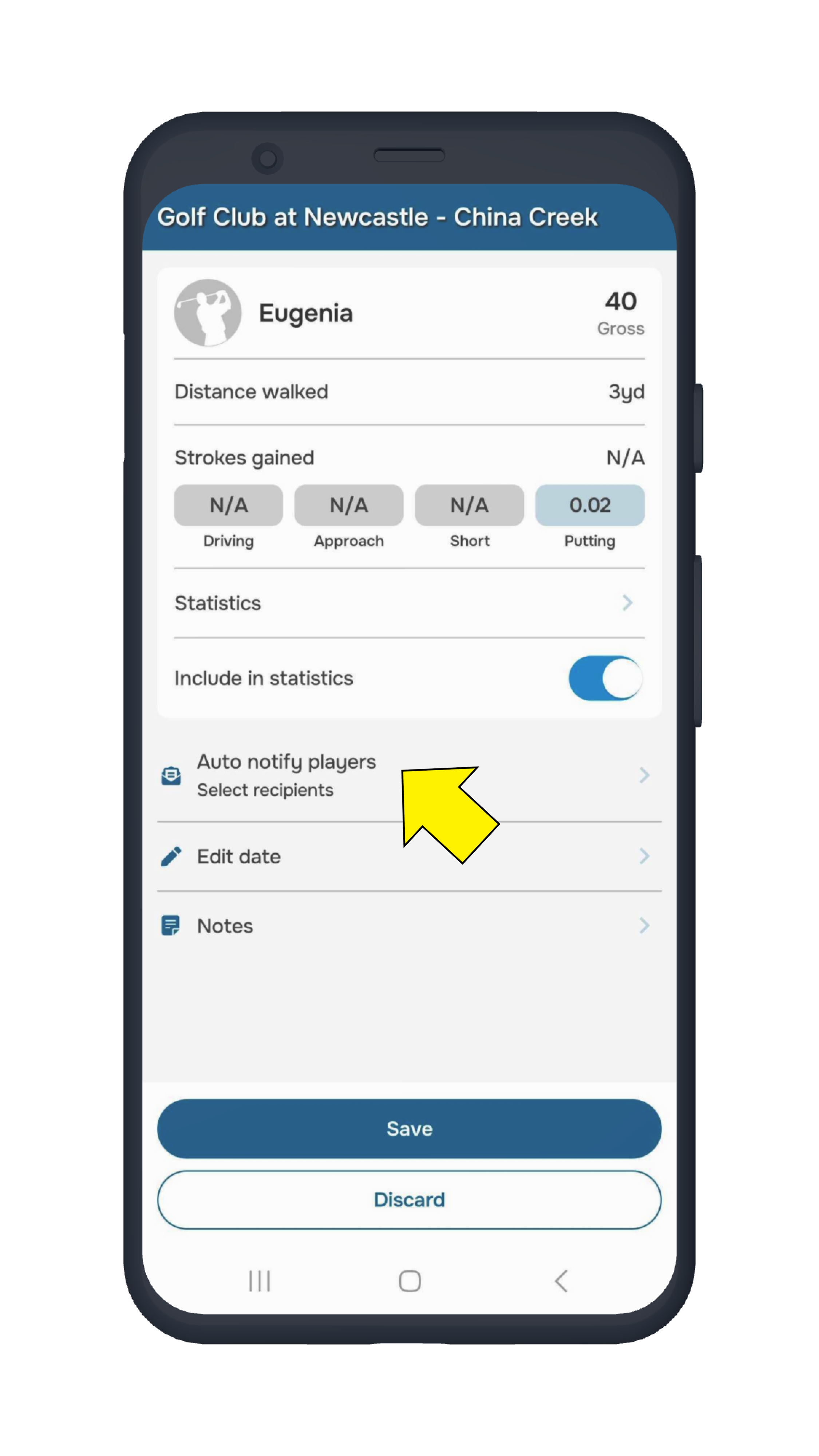To resolve this issue, after tapping "Finish round", please select "Auto notify players" - you will see a list of golfers and their email addresses. Please select yourself and/or other golfers you would like to share your results with. Detailed instructions can be found below.