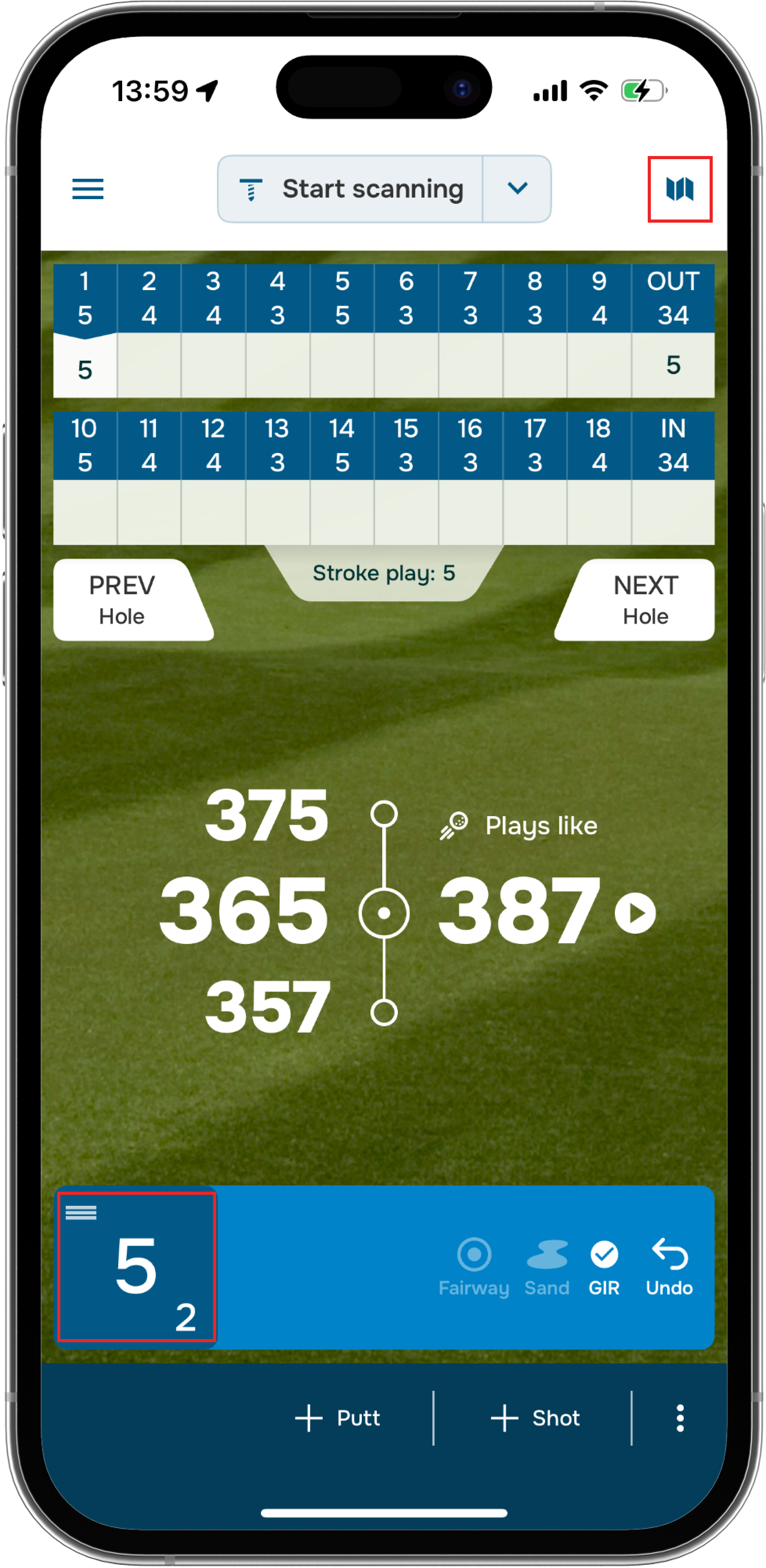 Once unlocked, you can view the shots you just recorded on the map, including the distance for each shot. Just use the map icon in the upper right corner. If you need to edit shots, add a missing shot or a penalty, change clubs or shot positions, you can do that too. Just tap the Quick score box in the lower left corner: