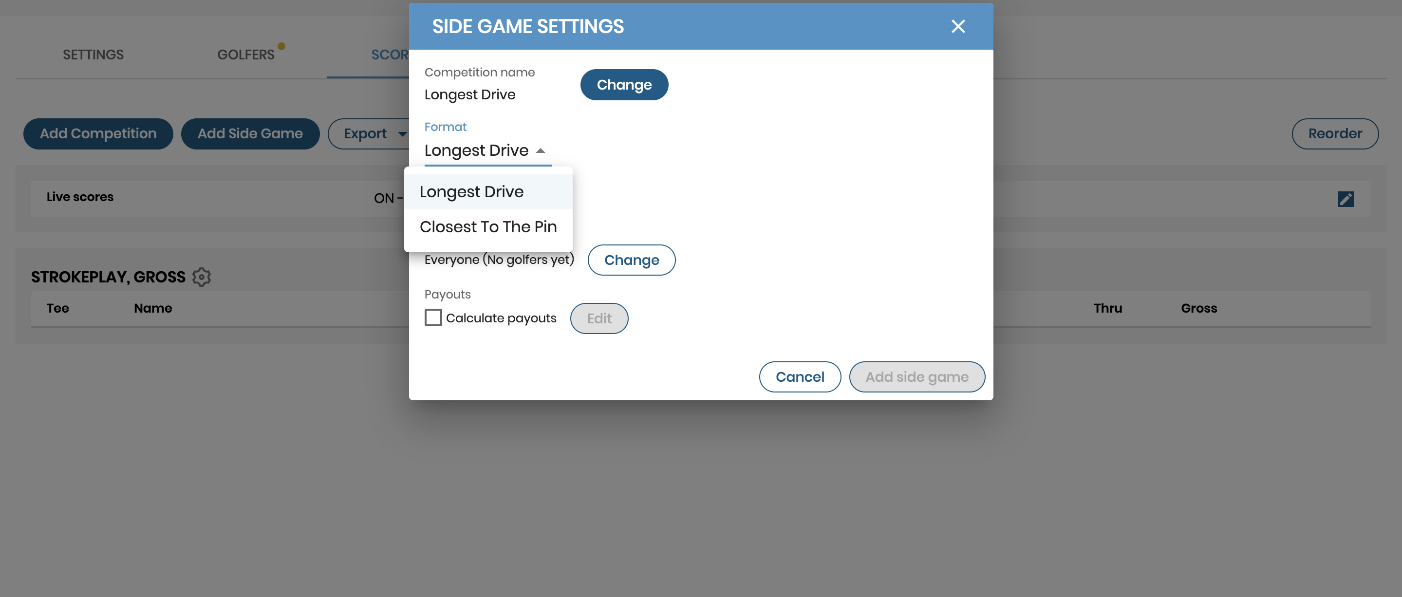 - Scoring - This is where you add the competition or multiple competitions. You can also add side games including closest to the pin, or longest drive.