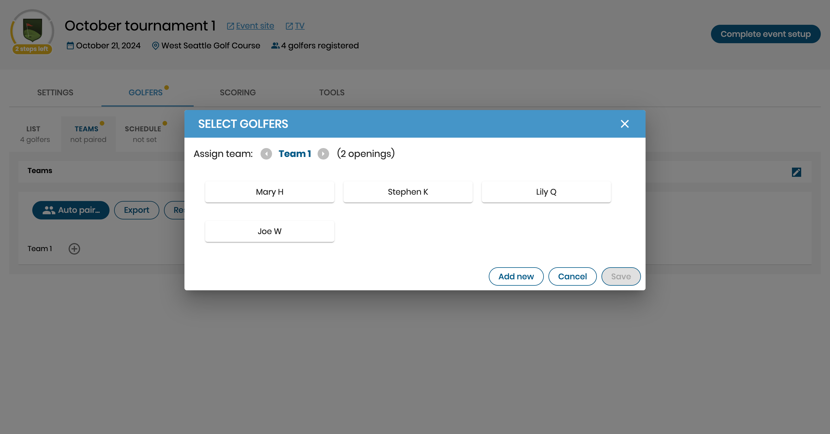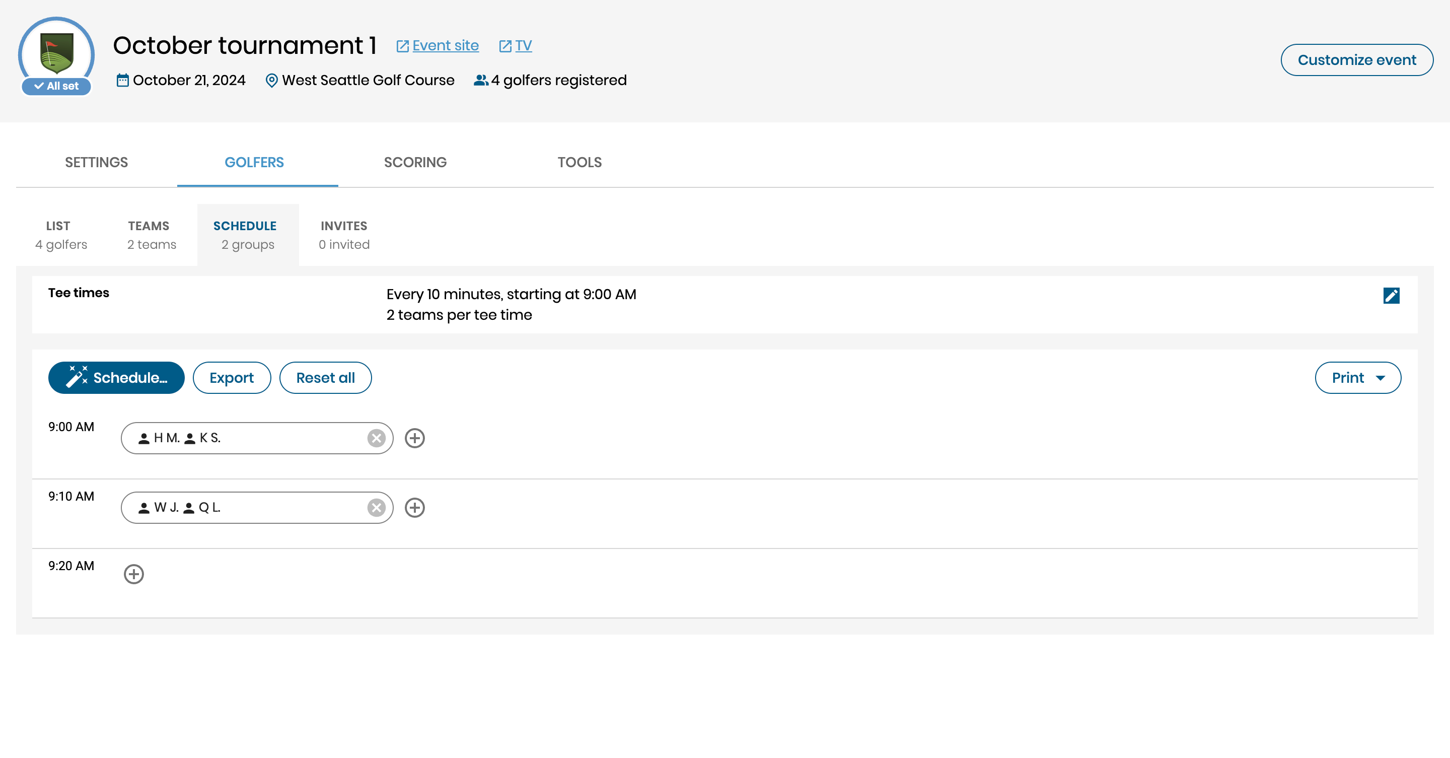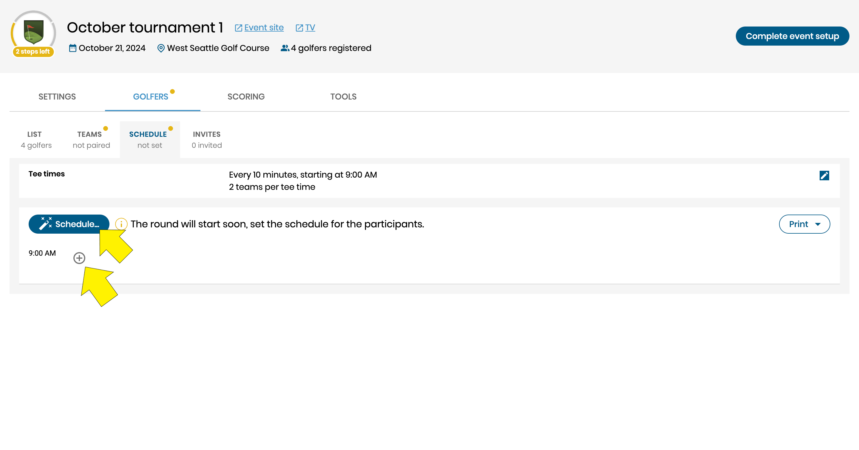 Once you have added golfers to the Event, and created teams (if necessary) it is time to set your schedule.