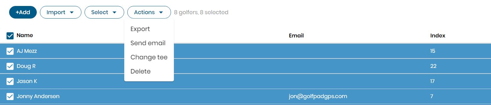Export - When golfers are selected the actions drop down will appear. Select the option to export and the file will begin downloading.
