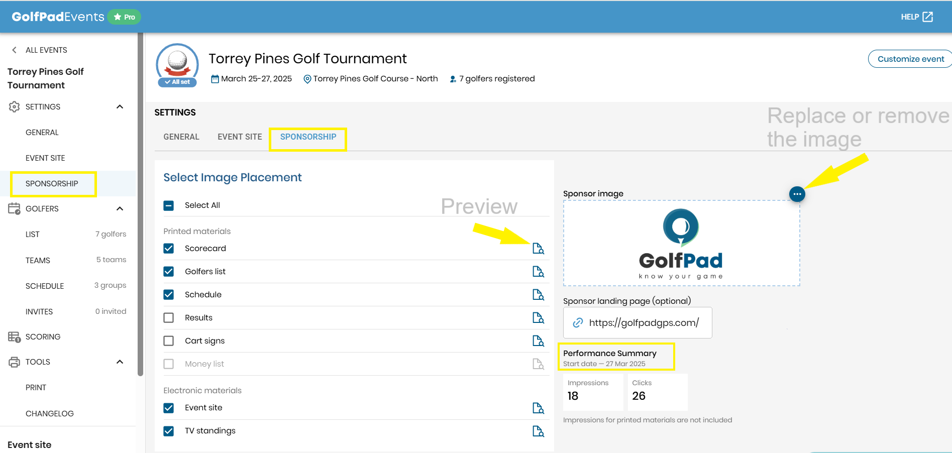 Introducing Sponsorship Opportunities: Elevate your events by showcasing your sponsors across a variety of platforms. With our new feature, you can easily display sponsor branding on both printed and electronic materials, including scorecards, golfers' lists, schedule, results, cart signs, money list, Event site and TV standings.