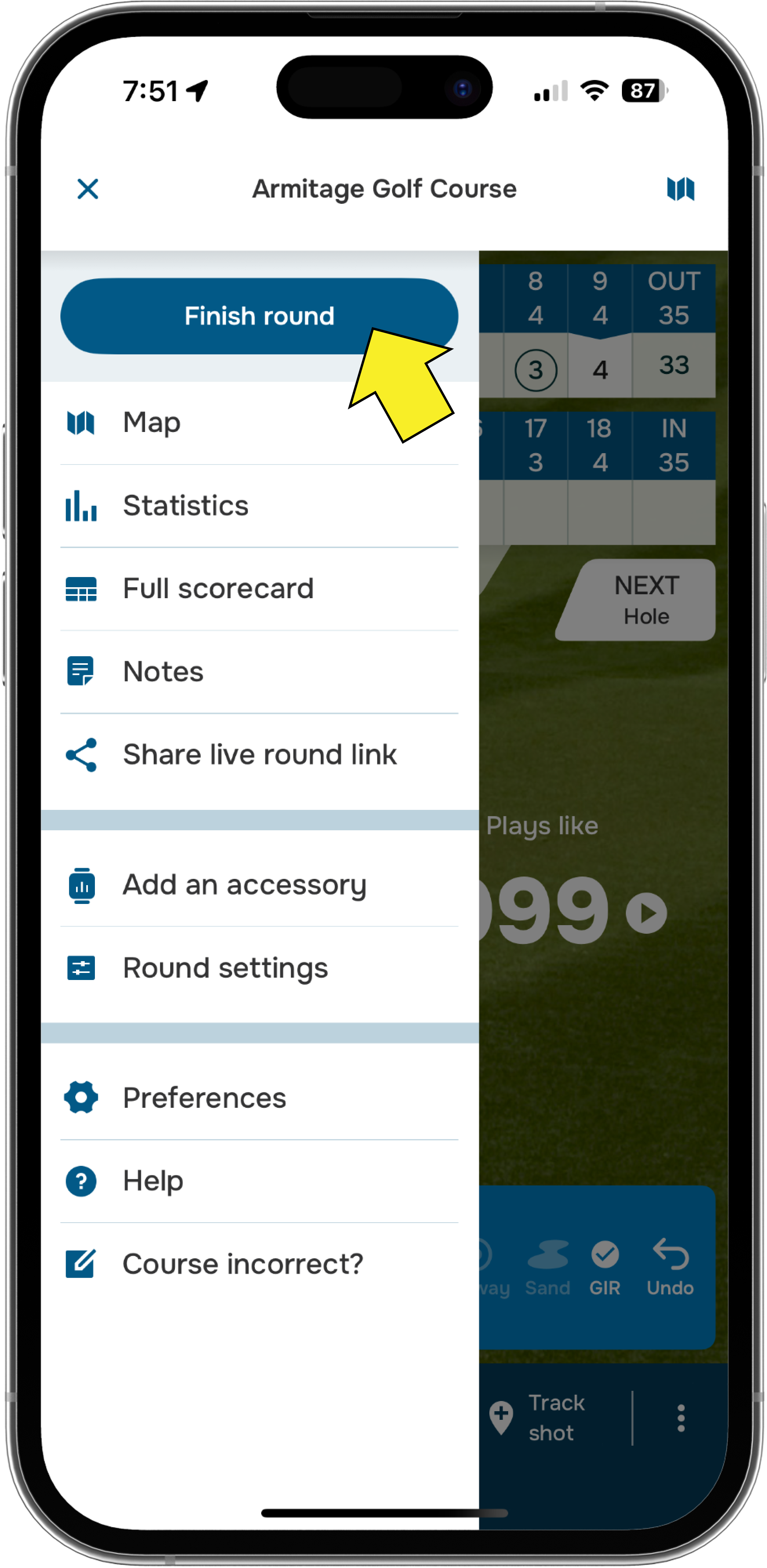 2. When you finish, tap the menu icon in the top-left corner and select Finish round.