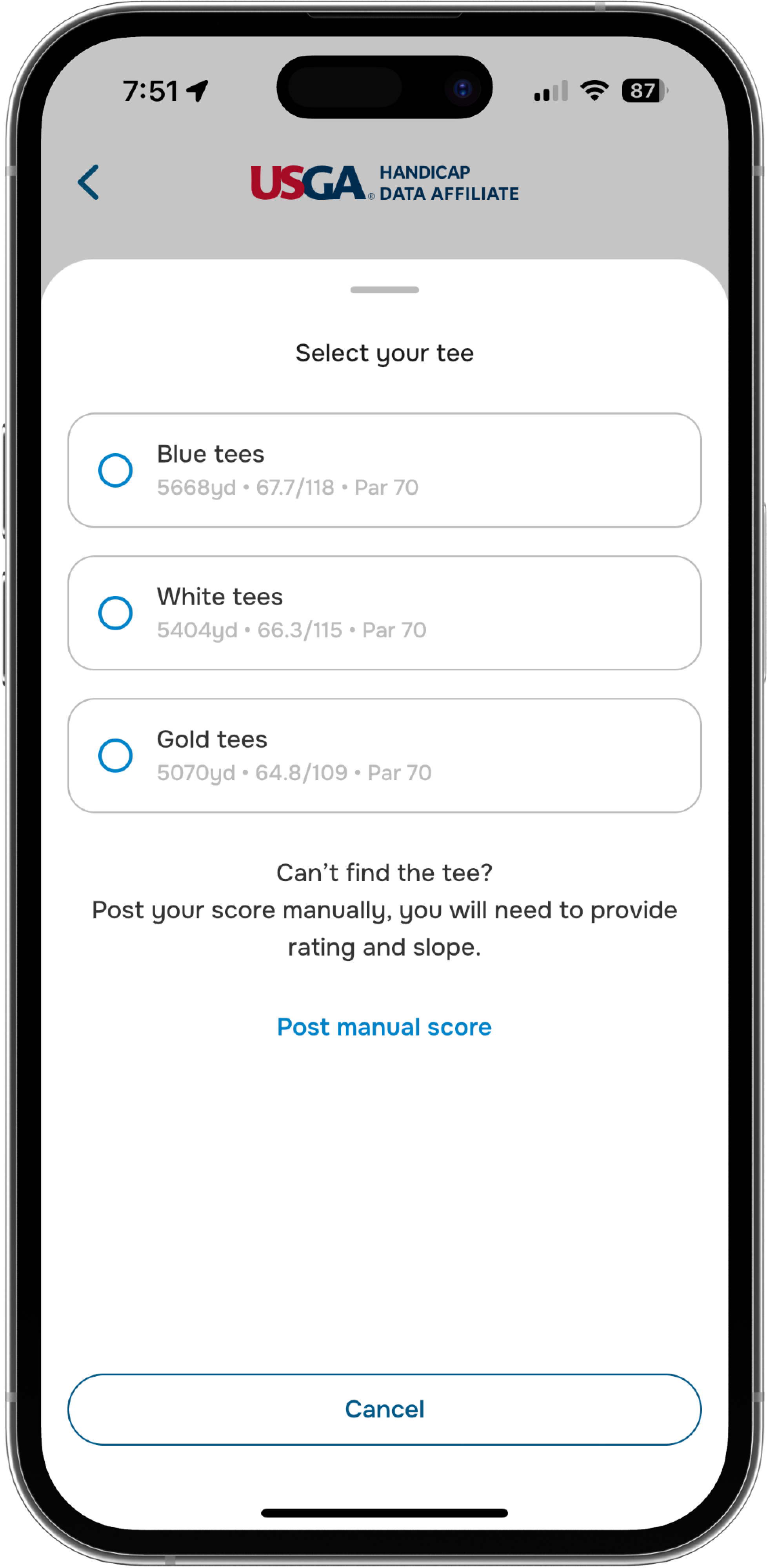 If the course you played is found in the USGA® database and your score is complete, you may just need to select the tee you played from (if it wasn't auto-selected).