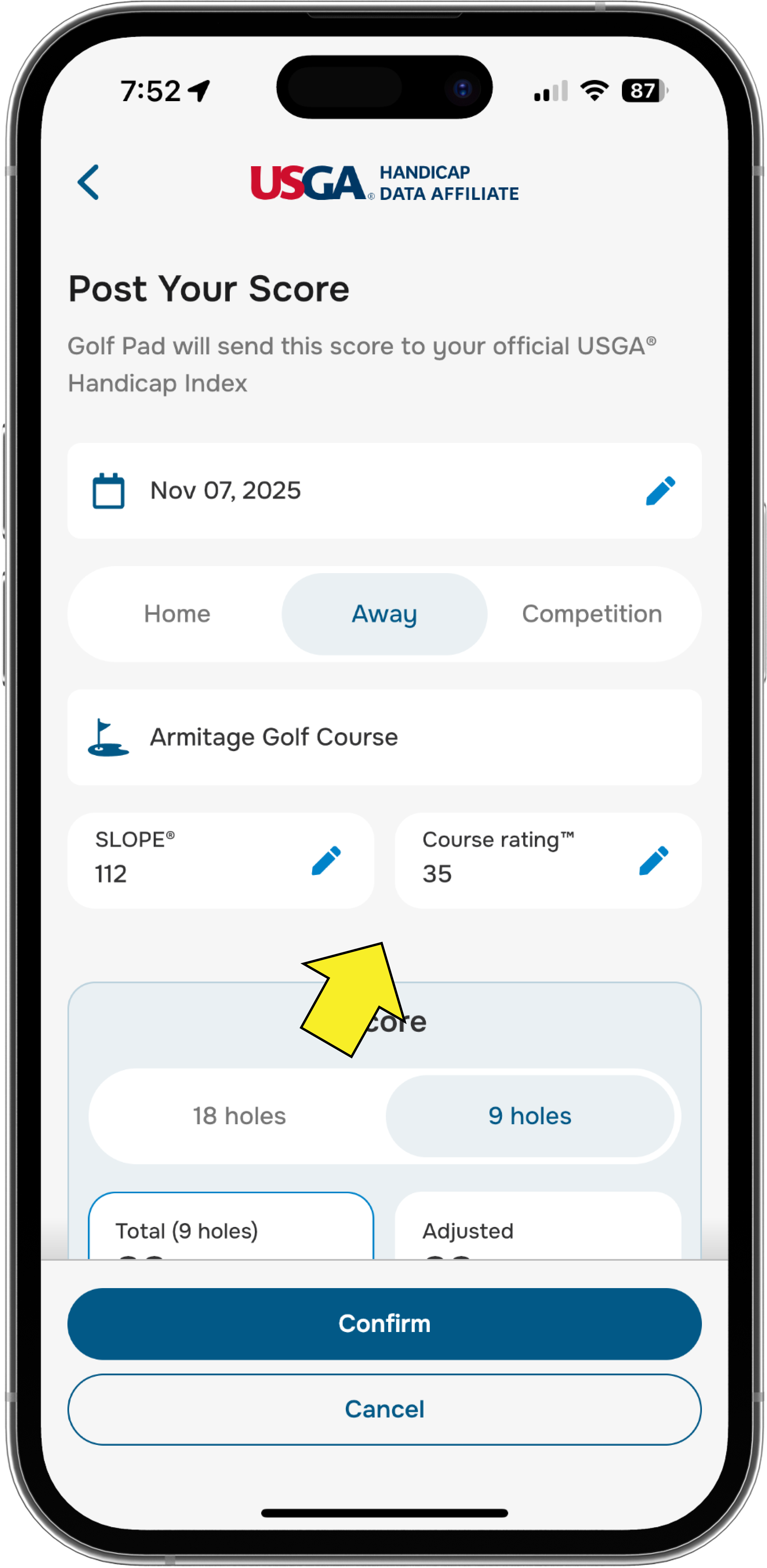 If needed, you can manually edit the Slope Rating®, Course Rating™, and adjusted score.